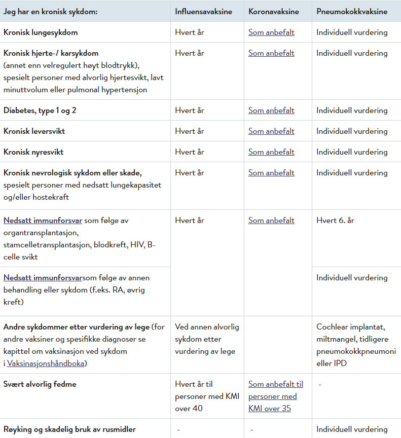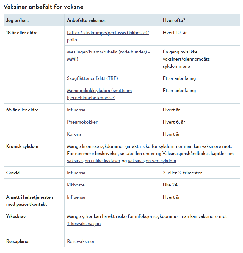 Oversikt over hvilke vaksiner folkehelseinstituttet anbefaler finner du her: Hvilke vaksiner anbefales til voksne? - FHI